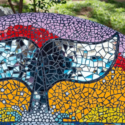 Esta plaza, transformada por el talento de una artista que ha decorado cada rincón con miles de pedacitos de azulejos de colores, formando varias obras maestras que te invita a sumergirte en un mundo de creatividad y tradición.